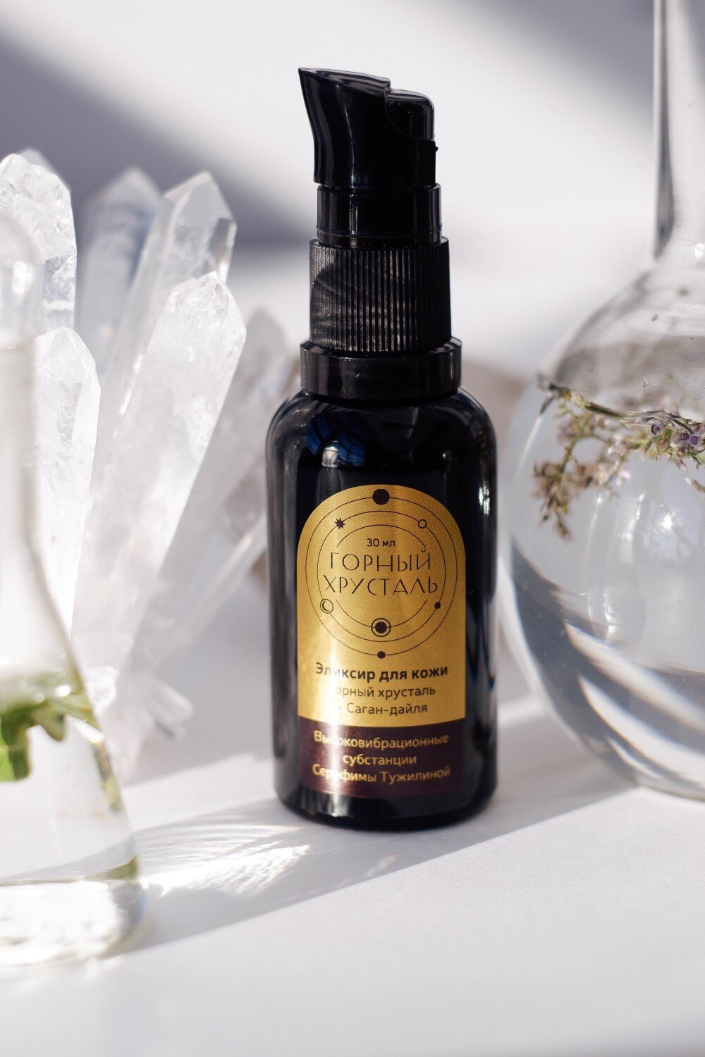 Эликсир создан на основе кристаллической (биоэнергетической) эссенции горного хрусталя и редкого, ценного эфирного масла горной саган-дайли.